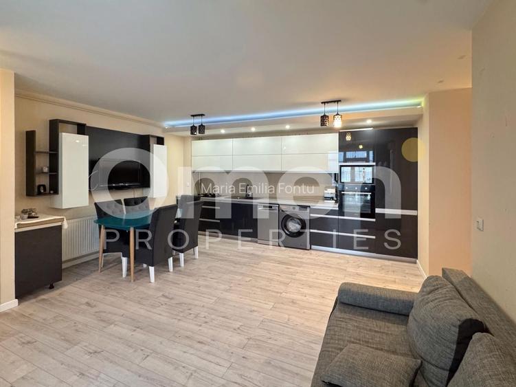 Apartamentul este compartimentat eficient și dispune de două dormitoare spațioase, un living aerisit cu bucătărie open space, baie, balcon și multiple spații de depozitare. Este complet mobilat și utilat, cu mobilier nou, ales cu bun gust, oferind un ambient modern, practic și plăcut.