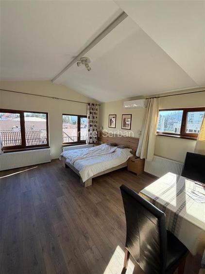 Vă propunem spre închiriere un studio spațios, cu o suprafață de aproximativ 50 mp, situat în Brașov, în zona Brașovul Vechi, o zonă apreciată pentru liniște, farmecul clădirilor istorice și apropierea de centrul orașului. Locuința este amplasată la etajul 2 al unei vile și oferă un ambient plăcut, luminos și primitor, ideal pentru o persoană sau un cuplu care își dorește un spațiu confortabil într-o zonă centrală, dar liniștită. Studioul este compartimentat astfel: un spațiu generos de tip dormitor living open space, foarte luminos, datorită suprafețelor vitrate mari, care oferă și o priveliște frumoasă către Tâmpa o baie modernă, închisă, amenajată cu bun gust o bucătărie modestă, practică și funcțională Apartamentul este dotat cu aer condiționat, oferind un plus de confort pe tot parcursul anului. Un avantaj important al proprietății îl reprezintă curtea frumos amenajată a vilei, situată la parter, unde chiriașii se pot relaxa, pot fuma sau pot petrece timp în aer liber, fiind posibilă inclusiv organizarea unui grătar într-un cadru intim și plăcut. Proprietatea este ideală pentru cei care își doresc un studio spațios, luminos și bine poziționat, aproape de centrul Brașovului, într-o zonă cu atmosferă autentică și acces facil către principalele puncte de interes ale orașului. Se închiriază pe termen de minim 12 luni cu posibilitate de prelungire. Se percepe o lună garanție, luna curenta + comisionul agenției de 50% din prima luna de chirie. Pentru mai multe detalii sau pentru programarea unei vizionări, vă stăm cu drag la dispoziție.