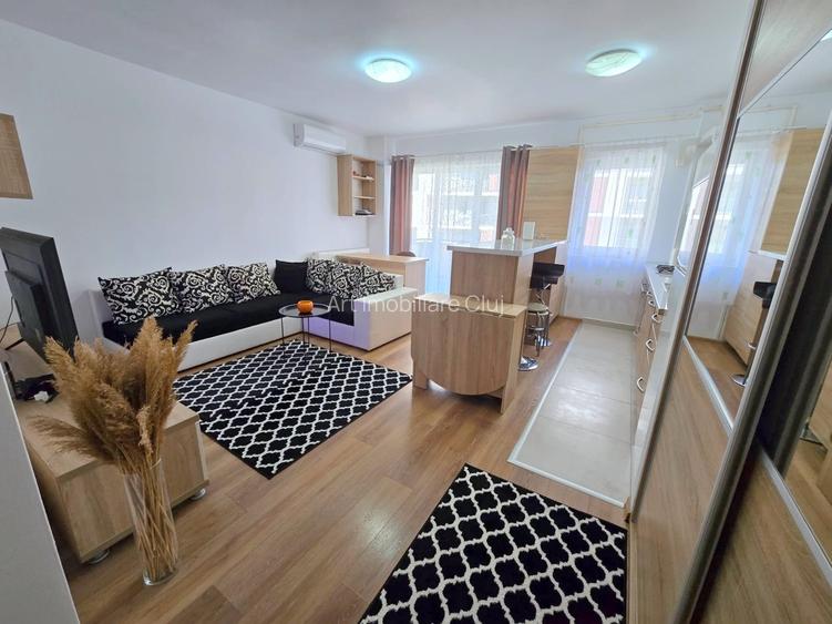 Apartamentul este situat la etajul 3 din 8 in bloc nou cu lift, are centrala termica proprie si aer conditionat, este semidecomandat si este compartimentat astfel: dormitor cu pat dublu si cu dulap pentru haine, living open space cu bucataria care este dotata cu cuptor electric iar in living este un coltar extensibil, un birou si mobilier, hol unde sunt 2 dulapuri pentru haine, o baie cu cada, un balcon spatios. Optional, separat, contra cost, se poate inchiria un loc de parcare subteran la pretul de 50 euro pe luna.