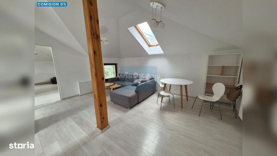 COMISION 0% Capital Imobiliare ofera spre inchiriere un apartament cu 2 camere semidecomandate, amplasat la mansarda unei case cu intrare proprie, pe o strada linistita, retrasa din traficul principal al zonei Gheorgheni. Compartimentare: -1 dormitor -1 living open-space cu bucatarie -1 baie -1 nisa (5 mp) + spatiu de depozitare sub scari Caracteristici: -Proaspat renovat -Foarte luminos ferestre multiple -Spatiu generos de depozitare (nisa + sub scari) -Intrare proprie -Pet friendly (conditie: 2 garantii) Pentru orice intrebari nu ezitati sa ne contactati!