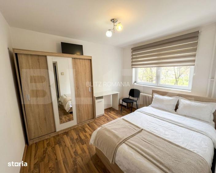 Blitz ofera spre inchiriere un apartament cu 3 camere, situat in cartierul Manastur, zona Primaverii una dintre cele mai cautate si bine conectate zone din Cluj-Napoca, ideala pentru studenti sau tineri profesionisti! Detalii apartament Suprafata utila: 54 mp Compartimentare decomandata Etaj: 1 din 4 Imobil bine intretinut, retras de la artera principala Apartamentul se remarca prin pozitionarea excelenta si compartimentarea practica, oferind liniste si confort, fiind inconjurat de arbori si spatii verzi. Compartimentare & dotari 3 camere separate, amenajate cu pat matrimonial, birou, TV si spatii de depozitare ideal pentru studenti Bucatarie mobilata si utilata: aragaz, frigider, centrala termica proprie Baie dotata cu cada Hol cu acces facil catre toate incaperile Confort & avantaje Centrala termica proprie Zona linistita, ferita de trafic intens Spatii verzi in imediata apropiere Localizare excelenta Situat in zona Primaverii, in inima cartierului Manastur, apartamentul beneficiaza de acces rapid catre magazine, cafenele, statii de autobuz cu legaturi directe catre toate punctele importante din Cluj-Napoca. Programeaza o vizionare si descopera o oportunitate excelenta pentru locuire sau investitie, intr-o zona extrem de cautata! Cod oferta / ID BLITZ: P169558