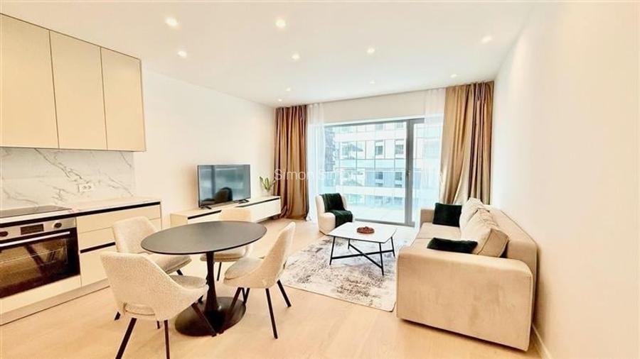 Apartamentul este situat la etajul 5 din 11, are 2 camere, living si dormitor matrimonial, baie cu dus, este semidecomandat si are o suprafata de 50 mp utili interior + 6 mp balcon. Apartamentul este mobilat si utilat complet modern, dispune de centrala de imobil cu contorizari separate pe fiecare apartament, aer conditionat, televizor, masina de spalat vase si rufe, incalzire prin pardoseala, paza 24/24h, iar pretul chiriei este de 950 euro / luna, in care este inclus si contractul inregistrat la Administratia Financiara.