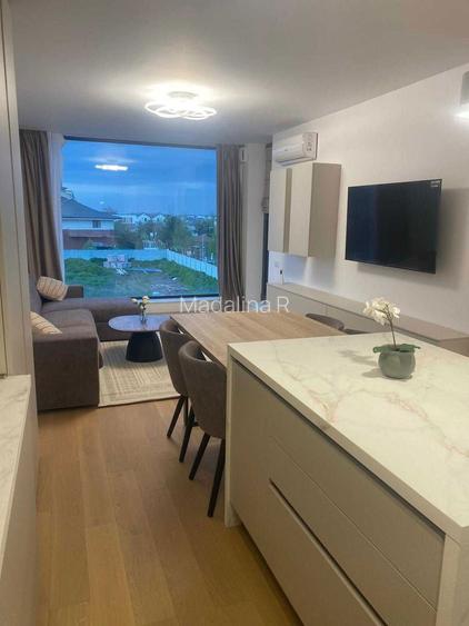 Apartament de 2 camere premium, complet mobilat si utilat, situat in complex Parc by Herastrau apartments (in centrul localitatii Tunari). Este la prima inchiriere, totul este nou. Disponibil imediat. Loc de parcare inclus. Pozitionat pe vest (apusuri superbe). Situat intre cele doua parcuri, langa casa de cultura, gradinita, iar in raza de 50 m este stadion, teren de fotbal, de tenis, piata, spatii comerciale, sala de sport, scoala, primaria, politia, statie de transport public si alte institutii de stat. Apartamentul are o suprafata de 54 mp utili si o terasa cu vedere catre parc, de 5 mp. Cladire eficienta energetic: 30% din surse regenerabile (Costuri de exploatare reduse semnificativ, comparativ cu o locuinta similara care nu indeplineste acest standard). Echipamente de recuperare a aerului sistem inteligent de ventilatie descentralizata cu recuperare de caldura. Interfon video. Lobby modern cu inaltimea de 9 m. Incalzire in pardoseala-Sistem de incalzire centralizat (centrala de scara), cu sistem de recirculare pentru a oferi apa calda intr-o clipa, eliminand risipa de apa (inclusiv energie) si reducand asteptarea apei calde la robinet. Contorizare separata utilitatilor pentru fiecare locuinta in parte. Lift pentru fiecare scara. Aer conditionat in fiecare camera, unitate multisplit. Mobilier pe comanda gama Creo, Italia, cu spatii generoase de depozitare. Electrocasnice incluse - TV, masina de spalat vase, masina de spalat rufe, uscator rufe, cuptor, plita, frigider, cuptor cu microunde - toate noi. Se percepe 1 luna chirie + 1 luna garantie Nu colaborez cu agentii.