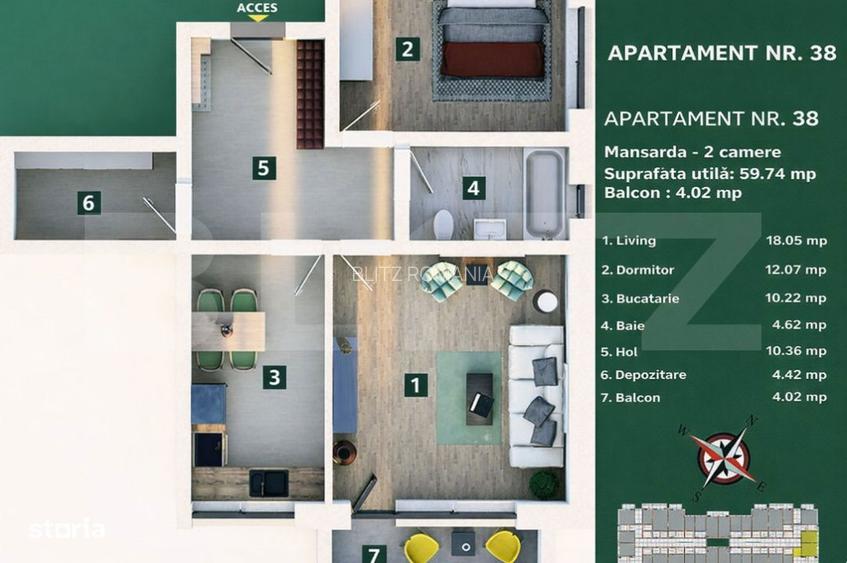 Apartament 2 camere, living cu bucatarie open space, balcon 59 mp