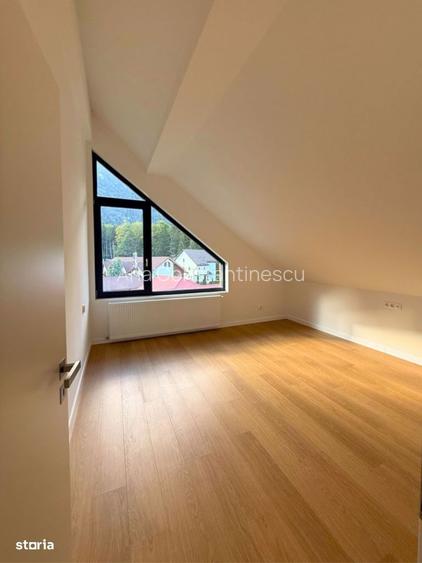 Un apartament care nu seamana cu nimic din ceea ce gasesti in mod obisnuit in Busteni. O mansarda inalta, luminoasa, cu ferestre spectaculoase si priveliste directa catre munte, gandita ca un refugiu de vacanta pentru liniste, aer curat si momente memorabile petrecute in familie.Apartamentul este pe tot etajul, are 2 camere si 62mp utili. Este pur si simplu inundat de lumina, pe tot parcursul zilei, in orice anotimp. De asta se asigura ferestrele triunghiulare gigantice si veluxul panoramic. Privelistea este una rara, de carte postala. Nu numai ca vezi muntele in toate anotimpurile, dar vezi si Crucea Caraiman in toata splendoarea. Am putea spune chiar ca sunteti vecini.Un alt aspect de care te vei indragosti este curtea. 150mp, amenajata si ingradita. Este locul ideal in care sa se joace copiii sau in care tu vei sta pur si simplu cu picioarele in iarba cat te bucuri de o cafea in