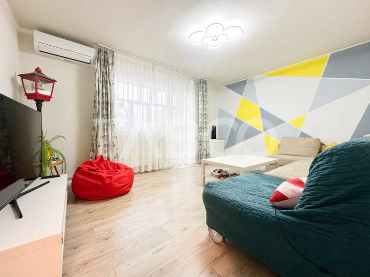 Apartamentul se vinde mobilat si utilat cu: plita electrica, cuptor, hota, masina de spalat rufe,masina de spalat vase, frigider cu congelator