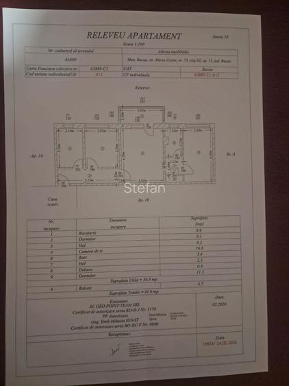 Va propunem spre vanzare un apartament cu 3 camere, situat intr-o zona linistita pe strada Miron Costin, nr. 75, in Bacau. Locuinta este situata la etajul 3 si este ideala pentru o familie care cauta un spatiu bine compartimentat si echilibrat. Detalii Suprafata si Compartimentare: Apartamentul are o compartimentare practica, avand o suprafata utila de 56.9 mp si o suprafata totala de 61.6 mp (incluzand balconul). Incaperile sunt distribuite astfel: Camera de zi: 16.6 mp (spatioasa si luminoasa) Dormitor 1: 11.5 mp Dormitor 2: 9.1 mp Bucatarie: 6.9 mp Baie: 3.4 mp Hol principal: 6.2 mp Hol secundar: 2.3 mp Debara: 0.9 mp (utila pentru depozitare) Balcon: 4.7 mp Informatii Juridice si Tehnice: Localizare: Mun. Bacau, str. Miron Costin, nr. 75, etaj III, ap. 15. Documentatie la zi: Cadastru si intabulare efectuate recent (februarie 2026). Cod unitate individuala Carte Funciara individuala Puncte forte: Etaj intermediar (3 din 4), oferind confort termic sporit. Compartimentare decomandata/semidecomandata eficienta, cu holuri ce separa zona de zi de cea de noapte. Balcon generos de aproape 5 mp cu acces din camera de zi. Spatiu de depozitare (debara) inclus in schita.