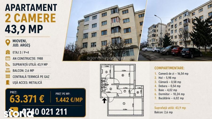 Apartament 2 camere - 44 mp - Et.3|4, Mioveni