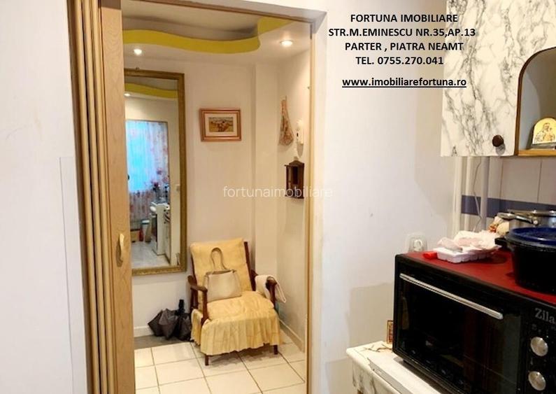 APARTAMENT 2 CAMERE, ETAJUL 2, ZONA ULTRACENTRALA, 59.000 EURO Daca sunteti in cautarea unui imobil pentru locuit sau pentru o investitie imobiliara, FORTUNA IMOBILIARE va supune atentiei acest apartament cu 2 camere, calduros si luminos, cu o structura semidecomandata, amplasat in zona ultracentrala din Piatra Neamt, la etajul 2. Apartamentul are orientare cardinala SUD - EST si pozitionare pe mijloc, fiind luminos si calduros. Are suprafata utila totala de 47,37 mp, este prevazut cu usa antiefractie, acces controlat prin interfon, termosistem exterior integral, centrala termica noua, termopan. Este compus din 2 holuri, bucatarie, 2 camere, baie si balcon. Se vinde mobilat si utilat, asa cum este prezentat in fotografii. Se afla la confluenta principalelor obiective de interes din Municipiul Piatra Neamt (turistice, comerciale, culturale, educationale, recreative, medicale etc). Pret 59.000 euro Pentru o prezentare detaliata a acestei oferte, furnizarea unor informatii suplimentare referitoare la situatia juridica / identificarea imobilului si programarea unei vizionari, va invitam la sediul nostru, Fortuna Imobiliare, situat in Piatra Neamt, str. M. Eminescu, nr. 35, ap. 13, parter, jud. Neamt, langa fostul Tribunal, tel. contact