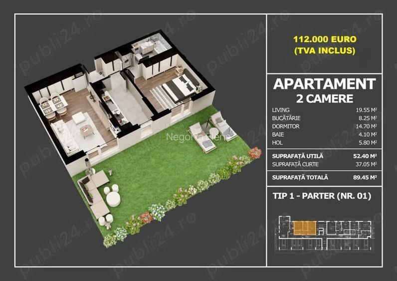 Va prezint un apartament modern cu 2 camere, situat la parterul unui imobil nou din Pope?ti Leordeni, cu un regim de inal?ime redus (P+3E). Cu o suprafa?a utila de 52.40 mp ?i o curte proprie generoasa de 37 mp, acest apartament este ideal pentru cei care i?i doresc un spa?iu exterior privat, perfect pentru relaxare sau pentru o cafea in aer liber. Finalizarea construc?iei este programata pentru vara acestui an, oferindu-va posibilitatea de a va muta in casa noua in cel mai scurt timp. Apartamentul beneficiaza de dotari de inalta calitate: Incalzire prin pardoseala Tamplarie PVC cu geam tripan Centrala termica de apartament Imergas Victrix. Cladire dotata cu lift Unul dintre cele mai mari avantaje este posibilitatea de a va alege finisajele. Pute?i personaliza aspectul locuin?ei dumneavoastra cu: Gresie, faian?a ?i parchet din colec?ia Avalon, cu un buget inclus de 80 lei mp. Obiectele sanitare pentru baie au un buget alocat de 2000 lei. Apartamentul este conectat la toate utilita?ile necesare: gaz, curent electric, canalizare ?i acces la servicii de internet televiziune. Op?ional, pute?i achizi?iona ?i un loc de parcare: Parcare exterioara: 10.000 Euro (TVA inclus). Parcare acoperita: 12.000 Euro (TVA inclus). Imobilul este situat in Pope?ti Leordeni, cu acces facil catre ?oseaua Olteni?ei ?i catre toate facilita?ile din zona, inclusiv magazine, ?coli, gradini?e ?i mijloace de transport in comun. Pentru mai multe informa?ii sau pentru a programa o vizionare, nu ezita?i sa ne contacta?i. Contact: Elena Negoi?a - 07 arata numarul ID anun? : 1772096171