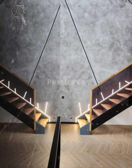 Acest apartament impresioneaza prin designul sau aerisit, cu tavane inalte de 6 metri, feronerie industriala expusa si suprafete vitrate generoase ce ofera luminozitate si un aer sofisticat. Structura pe doua niveluri – parter si mezanin – este legata de o scara interioara din sticla fumurie, detaliu care subliniaza eleganta si modernitatea locuintei.