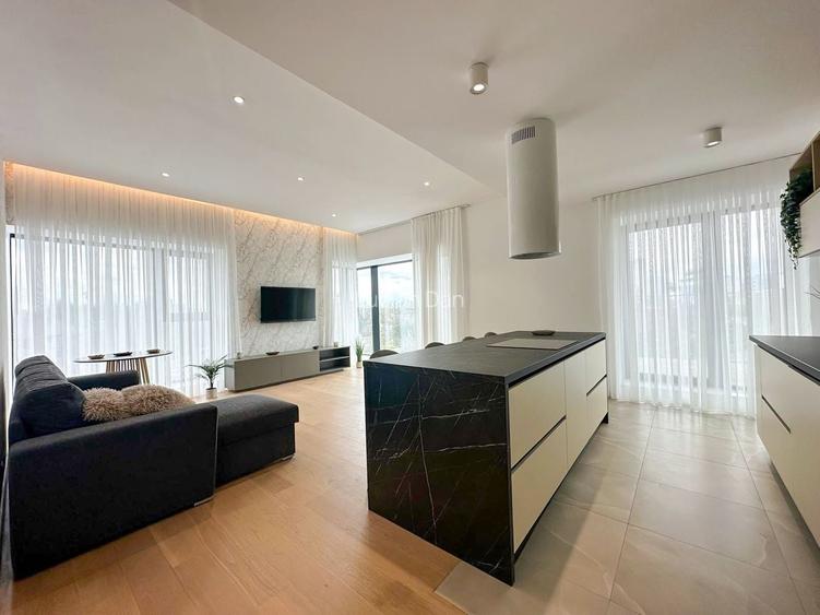 Zona de zi este luminoasa si primitoare, cu un living spatios si o bucatarie moderna amenajata in stil contemporan, cu insula centrala si finisaje atent alese. Designul interior pune accent pe linii curate, materiale elegante si o atmosfera calda, rafinata.