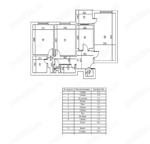Particular ofer spre vanzare apartament cu 3 camere, decomandat, situat in Bucuresti, zona Sebastian-Tutunari, intr-un bloc S+8E, construit in anul 1984, la etajul 8. Dispune de o suprafata totala de 67,9 MP . Alcatuit din: camere -3, bucatarie- 1, bai- 2, balcon- 1. Apartamentul necesita renovare completa. Apartamentul este liber si are toate actele complete (cadastru, certificat energetic, carte funciara). Caracteristici: -Pereti: vopsea lavabila, faianta -Podele: parchet, gresie -Contorizare: apometre, contor curent electric . -Imobil: interfon, supraveghere video . -Utilitati generale: curent electric, apa, canalizare, gaz. -Sistem incalzire: termoficare, calorifere Puncte de reper: Intesectia Str.sebastian cu Calea Rahovei. Acces facil la mijloacele de transport in comun. ID anun?