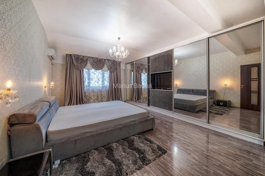 Camerele au suprafete remarcabile, de aproximativ 23 mp, 17 mp si 14 mp, dormitorul matrimonial beneficiind de acces separat catre o baie proprie de aproape 6 mp, un detaliu care aduce un plus de confort si intimitate. Spatiile de depozitare sunt atent gandite, cu dulapuri realizate pe comanda atat pe hol, cat si in cele doua dormitoare, oferind functionalitate fara a incarca vizual locuinta.