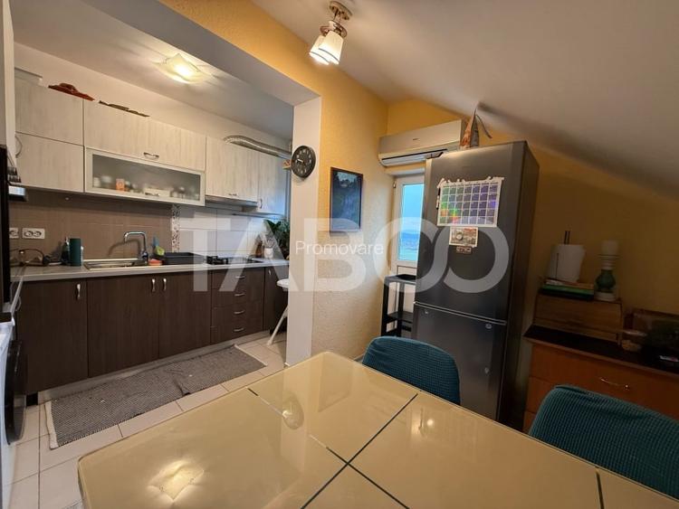TABOO Imobiliare propune un apartament de vanzare cu 4 camere, semidecomandat, situat in localitatea Sibiu, zona Tilisca, aflat la Mansarda intr-un imobil tip bloc cu regim de inaltime pe Parter + 4 Etaje + Mansarda; anul constructiei 2008, structura caramida. Suprafata utila de 72 mp + balcon de 5 mp.