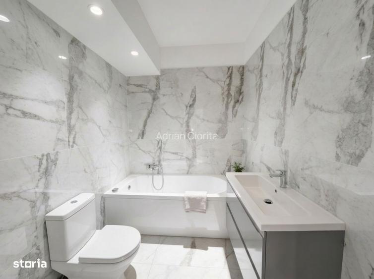 masura ce mergi spre living, observi ce se intampla cu lumina. 35 de metri patrati, decomandat, cu ferestre mari pe sud si vest, de la podea aproape pana la tavan. Lumina de dupa-amiaza cade pe parchetul de stejar montat in chevron si il face cald, aproape auriu. O canapea Chesterfield portocalie din catifea sta in fata ferestrelor, cu doua fotolii la fel. Deasupra, un candelabru cu tuburi de arama care prinde lumina si o imprastie pe tavan. Parchetul ala, cu modelul lui in V, da toata personalitatea camerei.Bucataria e deschisa spre living, cu o insula mare care separa cele doua zone. Corpuri suspendate negre lucioase, blat de piatra, accente de arama pe lustre. Plita, cuptor, frigider, totul echipat. Dimineata pui cafeaua, te sprijini de insula si privesti prin ferestrele livingului spre curtea verde a complexului. Gatesti, vorbesti, si esti in aceeasi camera cu familia, nu inchis intr-o bucatarie de 4 metri.Dormitorul mare are 18 metri patrati. Luminos, cu ferestre care lasa dimineata sa intre lin. Dressingul e deja acolo. Dormitorul al doilea, 12 metri, functioneaza ca birou real sau camera de copil nu ca un colt de masa langa canapea.Baia mare are cada. Marmura gri cu venatura neagra pe pereti si pe jos, mobilier suspendat, robinete de arama. Baia a doua, cu dus walk-in din sticla, aceeasi marmura. Cand le vezi, o sa te intrebi cum e posibil la pretul asta.Balconul. 22 de metri patrati. Douazeci si doi. Pui o masa de rattan, doua fotolii, un covor, cateva ghivece cu plante si ai o a doua camera afara. Dimineata bei cafeaua aici si vezi copacii din curtea complexului. Seara stai cu un pahar de vin si cerul e larg deasupra. Poti sa-ti imaginezi cum se simte asta?Un lucru important: in pozele de prezentare vezi apartamentul aranjat, cum va arata la predare. Daca vii acum la vizionare, o sa gasesti cutii ale proprietarei care e plecata din tara. Se strang in zilele urmatoare. Sub cutii e acelasi parchet chevron, aceleasi canapele Chesterfield, aceeasi bucatarie cu insula de arama si piatra. Totul e