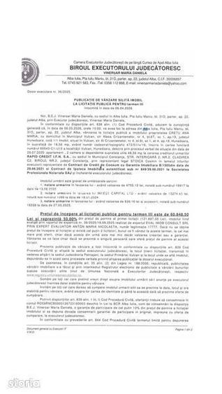 Va propunem spre vanzare un apartament compus din 2 camere si dependinte, avand o suprafata utila de 48.56 mp. plus cota de teren in suprafata de 18.56 mp., situat in Municipiul Vulcan, str. aleea Crizantemelor, nr. 4, bloc 6T, scara 1, etaj 4, apartament 19, judet Hunedoara. Apartamentul este situat la etajul 4 din 4 al blocului. Imobilul se vinde in procedura de executare prin licitatie publica, nu se poate viziona la interior! Urmatorul termen de licitatie are loc in data de 06.05.2026, ora 10:00 la sediul Biroului executorului judecatoresc VINERSAR MARIA DANIELA, (Municipiul Alba Iulia, Piata Iuliu Maniu, bloc 31D, apartament 22, judet Alba) pentru termenul III (50%) Dosar executare silita 36/2025 BIROUL EXECUTORULUI JUDECATORESC VINERSAR MARIA DANIELA. Pentru detalii suplimentare, va rog sa apelati numarul de telefon din anunt.