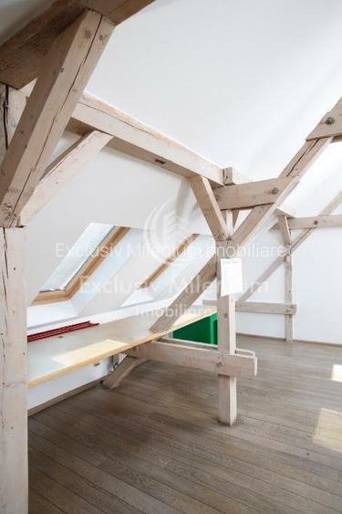 dusumea din lemn masiv iar pentru spatiile vitrate s-au folosit Velux-uri, cu sistem de umbrire incorporat.