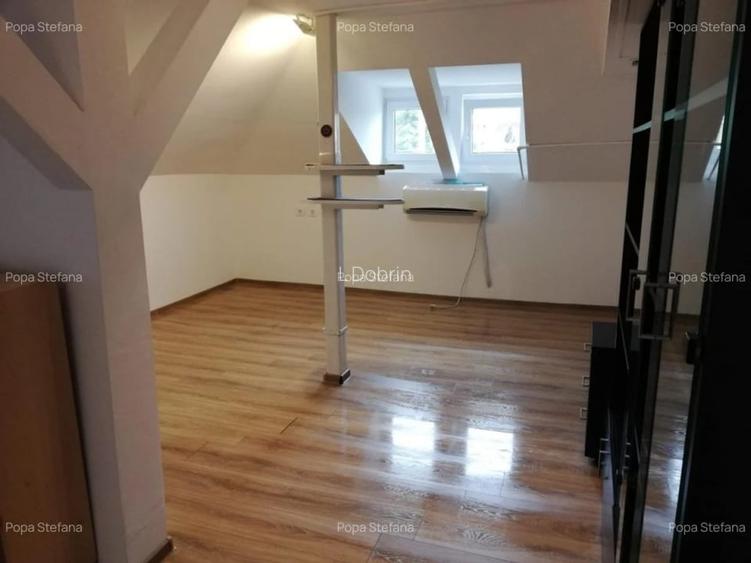 Mansarda inalta cu intrare separata, avand o suprafata utila de aproximativ 115 mp compartimentata in; receptie de (10.44 mp), hol, bucararie (7.00mp ), baie (5.75mp), camera open space (81.56 mp), spatiu in pod de aproximativ 25mp. Zona de open space putand fi impartita in 2 zone distincte.