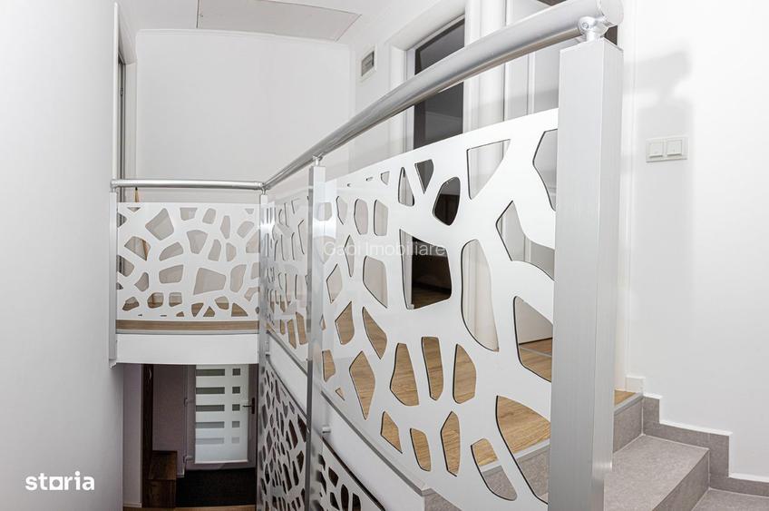 Casa noua de inchiriat in Cartier Grigorescu Oradea.Gabi Imobiliare va propune spre inchiriere casa situata in cartierul rezidential Grigorescu, Oradea, construita parter+etaj, in regim duplex dar independenta de imobilul invecinat deoarece fiecare modul are peretii proprii (nu unul comun) cu polistiren de 15 cm intre ei.Este amplasata intr-o zona linistita, aflata la prima inchiriere, cu o amprenta bine definita asupra designului printr-o amenajare armonioasa, imaginile din fotografiile atasate fiind sugestive, toate acestea la un loc facand din acest duplex un ambient primitor, imbietor.Suprafata terenului aferent este de 300 mp impreuna cu amprenta la sol, cu un front stradal generos, in fata casei pe teren proprietate privata este amenajat si locul pentru parcare (pentru 2 masini).In suprafata construita de 100 mp+ terasa acoperita /generoasa, suprafata utila de 120 mp casa este compusa din:la parter: hol de intrare, living cu loc pentru luat masa, bucatarie, iesire in terasa, o baie, scarile interioare ofera acces la etaj;la etaj intalnim 2 dormitoare si o baie.Gustul desavarsit cu care a fost conceputa si executata casa dau o valoare apreciabila acestei case. Finisajele sunt de o calitate foarte buna, cu materiale de calitate inalta, gresie, faianta, instalatii foarte bine executate, incalzirea in pardosea prin centrala gaz cu termostat ambiental, zugraveli de calitate.Constructia casei a fost atent supravegheata, caramida POROTHERM, pereti de interior grosi, cu locuri de parcare auto in fata casei. Din punct de vedere al finisajelor de asemenea incepand de la instalatia electrica, termica, prize, intrerupatoare, izolatie de polistiren de 15 cm, imprejmuire cu gard si fundatie, etc.Curtea este complet