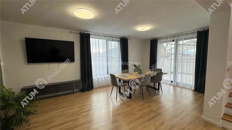 Casa tip duplex de inchiriat, cu o suprafata utila de 120 mp, distribuita pe parter si etaj plus pod de depozitare, pretabila pentru spatiu de locuit, situata in zona Veteranilor de Razboi din Sibiu. Casa este compusa la parter din hol la intrare living cu spatiu pentru dinning si iesire pe terasa, bucatarie complet mobilata si utilata, baie cu geam de aerisire, spatiu de depozitare sub casa scarii iar la etaj sunt 3 dormitoare, o baie cu geam de aerisire si balcon. Imobilul detine dotari si finisaje precum: usi de PVC la intrare si la terasa, tamplarie PVC cu geamuri termopan, ziduri din caramida izolati exterior, tenciuti si gletuiti la interior, centrala termica cu incalzire in pardoseala, aer conditionat. Curtea imobilului este pavata in zona de acces pietonal si auto, terasa acoperita. Valoarea de inchiriere a casei este de 1150 euro luna + o