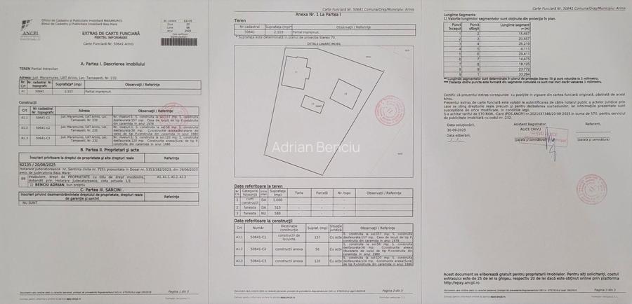 Proprietar vand fara intermediari sau schimb cu spatiu comercial in B.M. + diferenta, teren, casa, sura, anexa bucatarie vara cu lemnarie, beci din beton tip hruba, casuta lemn, etc. situate in Tamasesti, Maramures, la 43 km de Baia Mare si la 45 km de Zalau. Casa are 157 mp, a fost construita din caramida in anul 1978, are 3 domitoare, 1 baie, bucatarie, sufragerie si 2 holuri, compartimentata conform poza. Geamurile si usile sunt din lemn masiv. Sura are 120 mp, a fost construita din caramida in anul 1986, are un garaj, iar anexa bucatarie de vara a fost construita in anul 1980 si are 56 mp. Beciul subteran este din beton armat, cu drenaj, fiind uscat tot anul. Terenul total care se vinde are 4200 mp din care 2103 mp in proprietate, iar 2097 mp este in folosinta. Gospodaria dispune de curent trifazic, apa de la reteaua publica in camin la poarta, fantana cu hidrofor, boiler 100 l pt. apa calda si sobe de teracota pe lemne pt. incalzire. Fibra optica si catv Digi sunt pe stalp la poarta. Drumul este asfaltat pana la poarta, iar in scurt timp localitatea va fi conectata la reteaua de gaze naturale. In pret sunt incluse si o minimoara de macinat cereale, un circular pt taiat lemne si un motor electric trifazic de 3,5 kw functional pe ambele.
