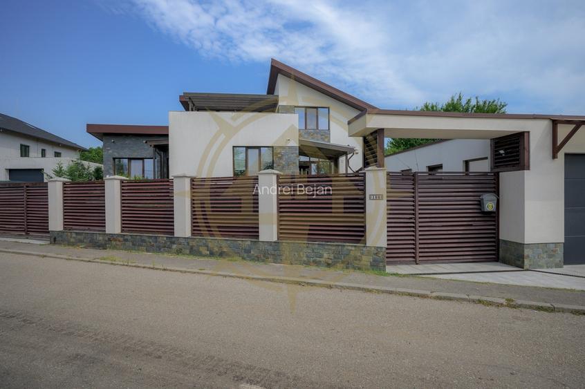 Exterioarele sunt la fel de impresionante ca si interioarele. Vila dispune de un garaj spatios de 40 mp, doua locuri de parcare (unul in curte cu poarta separata de acces si unul in fata garajului), si un foisor de 40 mp, care include o magazie de 6 mp si un grup sanitar. Gradina superba amenajata, cu aproximativ 500 mp de gazon, este ingrijita cu ajutorul unui sistem automatizat de irigat, controlabil prin intermediul telefonului mobil.