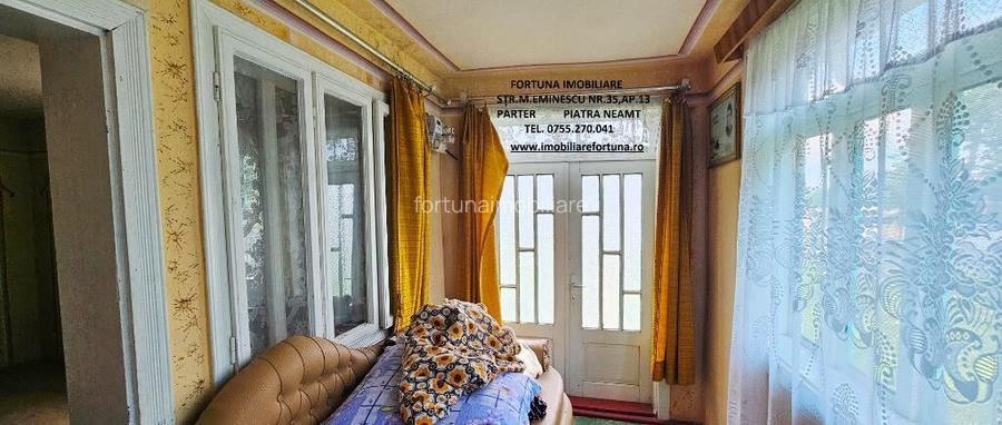 PROPRIETATE COM.BODESTI, CASA + ANEXE + TEREN 7.481 MP, CRACAUL IN FATA SI PADUREA IN SPATE, 40.000 EURO Daca iti doresti sa scapi de stresul si stilul de viata agitat din mediul urban, sa fii inconjurat de natura si sa dai o sansa traiului linistit, lipsit de grijile cotidiene, FORTUNA IMOBILIARE propune spre achizitie aceasta proprietate, compusa din suprafata de 7.481 mp teren intravilan si casa, situata in intravilanul comunei Bodesti, jud. Neamt. Casa, cu o amprenta la sol de 100 mp este edificata in anul 1958, pe fundatie din beton, zidarie din caramida, acoperita cu tabla zincata. Este compusa din hol, 4 camere, baie si bucatarie. Proprietatea este prevazuta cu diverse anexe gospodaresti : beci, o magazie pentru unelte gospodaresti si o anexa din BCA la gri. Proprietatea este conectata la reteaua de electricitate, incalzirea se face cu sobe din teracota pe lemne, iar pentru apa sunt 2 fantani, una in curte si una in beciul de sub casa, de unde se trage apa pentru baie.Casa necesita investitii pentru revitalizare . Terenul, cu suprafata de 7.481 mp si front stradal de 20 ml, ofera posibilitatea unei dezmembrari pentru a fi construite mai multe case. Aceasta proprietate reprezinta o oaza de liniste si confort, unde va puteti bucura de intimitate, aer curat si de frumusetea naturii. Pret 40.000 euro. Pentru o prezentare detaliata a acestei oferte, furnizarea unor informatii suplimentare referitoare la situatia juridica / identificarea imobilului si programarea unei vizionari, va invitam la sediul nostru, Fortuna Imobiliare, situat pe str. M. Eminescu, nr. 35, ap. 13, parter, langa fostul Tribunal, tel. contact