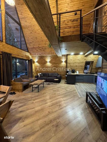 Cabana A-Frame din lemn cu doua dormitoare inchise,o camera mica la mansarda, doua bai, living cu bucatarie complet utilata, camera tehnica,pod.Cabana este situata pe munte, la marginea padurii, intre Bran si Zarnesti, are o amprenta la sol de 100m , 135mp utili si dispune decentrala pe gaz (incalzire in pardoseala)utilitati: apa, electricitate(trifazic), gaz, internet, televiziune prin cabluTV led cu diagonala mareterasa, foisor, gratar, ciubar fibra, magaziemobilier din lemn masivlambriu exterior termotratatfosa ecologicaizolatie cu vata bazaltica Rockwool de 20cmgeamuri Salamander Tripancamere videoProprietatea are 1500m impartita in doua platouri , pe unul este amplasata cabana, iar pe celalalt sunt trase deja utilitati.Cabana poate fi casa de vacanta sau afacere la cheie, ea se inchiriaza de 4 luni avand un procent de ocupare de 85%.Nu avem ursi zona !Mai multe detalii la telefon!
