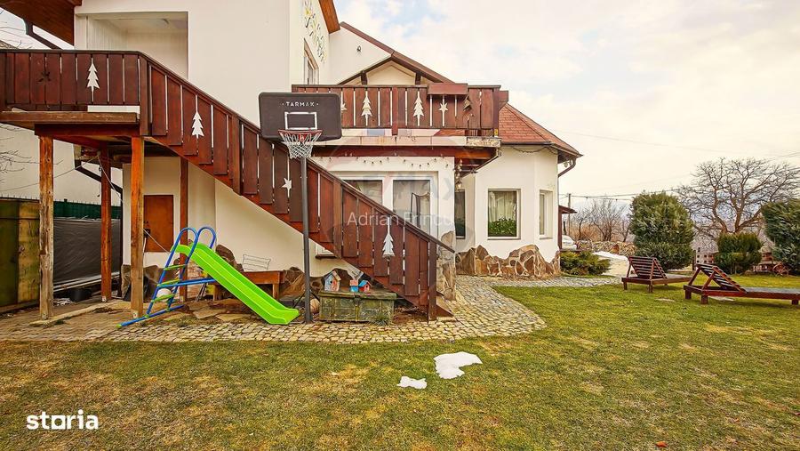 Agentia imobiliara Remax Evolution va prezinta, spre vanzare, in sistem de reprezentare exclusiva si cu comision 0% din partea cumparatorului: Cabana La Flo este o vila rustic-moderna de cazare turistica situata in satul Sohodol (comuna Bran), la poalele Muntilor Bucegi si Piatra Craiului, la aproximativ 4 km de renumitul Castel Bran. Locatia ofera un cadru natural spectaculos, aer de munte curat si privelisti impresionante, perfect pentru relaxare, aventuri si evadari in natura. Cu un teren generos de 888 de metri patrati, aceasta proprietate iti ofera spatiu pentru a-ti desfasura visurile si ideile. Cu 8 camere primitor amenajate si un apartament elegant, fiecare cu baia proprie, oferi oaspetilor tai confort si intimitate. Atat parterul cat si mansarda sunt gandite pentru a incanta simturile si pentru a oferi privelisti uluitoare catre frumusetea naturala inconjuratoare. Punct gastronomic local - La Cabana La Flo gasesti optiuni de mancare traditionala romaneasca, preparata cu ingrediente locale proaspete, conform specificului zonei Bran-Bucegi. Pe langa mesele traditionale, poti savura si gratare in aer liber sau pregatirea unor preparate la ceaun, intr-o atmosfera relaxata alaturi de familie sau prieteni. Pentru cei in cautare de adrenalina, Cabana La Flo ofera excursii cu ATV-uri pe teren montan. Centru de experienta montana In cadrul cabanei exista multiple facilitati ce iti permit sa experimentezi viata la munte: spatii de relaxare si foisoare pentru socializare zone de gratar si terase panoramice pentru recreere posibilitati de inchiriere legate de sport si explorare (biciclete, echipament etc.) Cabana La Flo pune la dispozitie facilitati de wellness pentru relaxare: jacuzzi / zona de hidromasaj folosit pentru relaxare in natura. La proprietate se ajunge din DN 73 in aprox. 10 min pe strada Muchia Hotarului 55B. Terenul este de 888 mp, front de 37 m. Vila este construita in 2012. Amprenta la sol este de 140 mp, regim de constructie P+M. Vila are o centrala noua pe lemne de 42 Kw din 2025, cu 2 rezervoare de 250 l si 150 l. Constructia este realizata cu fundatie de beton, planseele din grinzi de lemn peste care este turnata sapa cu armatura, izolatia este din polistiren grafitat. Vila este insorita, avand orientarea in principal spre sud si est. Proprietatea este amplasata intr-o locatie privilegiata, la 3,8 km de DN73, la 4,6 km de Castelul Bran, la 13 km de autostrada A3. In zona mai sunt Cetatea Rasnov, Dyno Park, Magic Park, Alpine Coaster Cheile Gradistei. De asemenea, se afla in proximitatea Aeroportului International Ghimbav, asigurand un acces rapid si comod, cat si la aproximativ 43 de minute distanta cu masina de Brasov. Clasa energetica: A Consum anual specific de energie: 61,57 kWh/m2an Indice de emisii echivalent CO2: 19,66 kgCO2/m2an Consum anual specific de energie din resurse regenerabile: 0 Kwh/m2an Va multumim si va stam la dispozitie cu detalii suplimentare despre acest imobil.