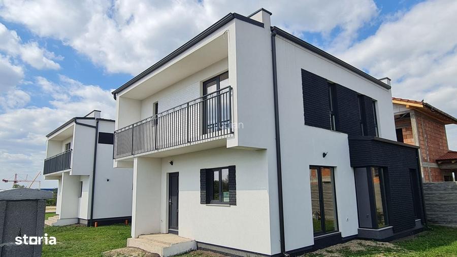 Proprietar vand 1 2 duplex modern P+E in Dumbravita, str. Poeziei. Duplexul este la gri (interior la rosu), despartit de camera tehnica (7 m intre corpuri).Este compus din 5 camere, 3 bai, camara, spatiu depozitare si spatiu tehnic.Bransamente la utilitati.Zona foarte linistita. 117 mp utili, teren 350 mp si terasa de 8 mp. Loc de garaj intre corpuri.Frontul stradal este de 19.5 m.Tamplarie PVC Salamander 76MD sticle tripla, izolatie polistiren 10 cm.Parter- Living+bucatarie,- Birou,- Baie,- Camara,- Spatiu depozitare,- Camera tehnicaEtaj- Dormitor matrimonial cu baie si SAS,- 2 camere,- Baie