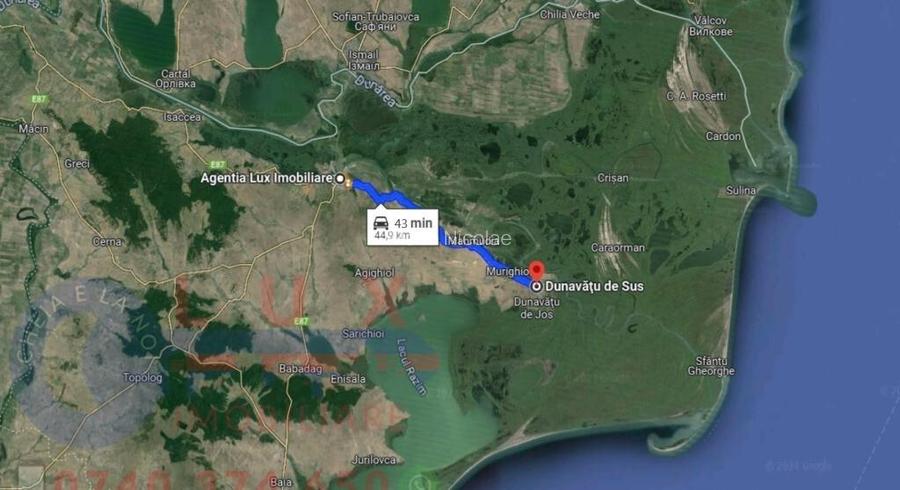 Cauti o proprietate in Delta Dunarii cu potential de dezvoltare? Agentia Lux Imobiliare va propune spre vanzare casa cu teren amplasata in DUNAVATU DE SUS, Comuna Murighiol. Localitatea se afla la 44,9 km de Orasul Tulcea (43 minute mers cu masina), in Delta Dunarii, cu deschidere catre Canalul Dunavat ce duce la bratul Sfantu Gheorghe. Casa este formata din 2 corpuri (construite din paianta) si este amplasata pe un teren cu suprafata de 2.514 MP. Terenul are un front stradal de 16,68 ML si o DESCHIDERE de 38,48 ML la CANALUL DUNAVAT!! Corpul 1 (44 mp) este renovat complet si este compus din hol, 2 camere si baie. Corpul 2 (50 mp) este compus din 2 camere si bucatarie. Incalzirea se face cu sobe si dispun de utilitatile necesare: apa si curent electric. +++ Sistem de supraveghere video +++ Se vinde MOBILATA si UTILATA! Proprietatea are potential turistic si este ideala pentru o investitie in turism! PRET 93.000 EURO Contact: