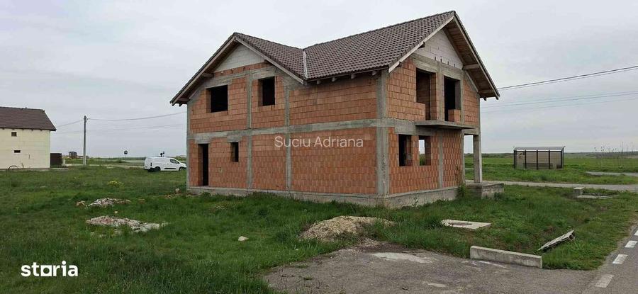 Vand casa de locuit, in rosu. P+M. Suprafata construita la sol 120 mp. Suprafata construita desfasurata 233 mp. Situata in cartierul nou de locuinte, in loc. Alunis, com Frumuseni, jud.Arad, la 20 de min. de centrul Aradului. Amplasata pe colt, in spatele statiei de autobuz cu posibilitatea de acces din ambele strazi. Parter compus din hol, casa scarii, bucatarie mare, camara, sufragerie mare, terasa, baie de serviciu, camera tehnica. Mansarda compusa din hol, 4 dormitoare din care 2 cu balcon, baie. Dispune de curent electric bransat in contor, apa menajera bransata in contor, canalizare bransata la retea. Retea de gaze in fata casei. Pret 70500 E usor negociabil.