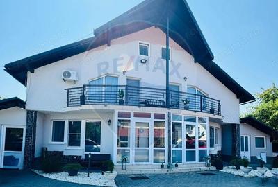 Vand proprietate deosebita, compusa din casa+teren aferent 44 ari, foisor din barne de lemn cu terasa, curte amenajata, parau ce cade in cascada direct intr-un mic lac, crama foarte frumos amenajate. Casa in suprafata de 270 mp, P+1 din caramida cu decoratiuni exterioare din lemn, izolata, dotata cu sistem de supraveghere video si sistem de alarma, finisata lux (marmura, piatra, lemn masiv), geamuri termopan tripan, semineu, microcentrala pe gaz , boiler electric separat, panouri solare, vitralii. Casa este compartimentata astfel: parter :hol de intrare vestibul, living foarte spatios cu geamuri mari, luminoase, loc de servire a mesei, biblioteca, camera, baie, bucatarie, terasa, camera tehnica. etaj : 2 dormitoare cu dressing si baie separat, terase mari la fiecare dormitor. Se vinde mobilata si utilat. Foisorul dispune de apa curenta rece si calda, fiind dotat cu gratar pentru barbeque, cuptor cu lemne, plita pe gaz. Zona este extrem de frumoasa si linistita, curtea fiind amenajata cu vegetatie naturala, un iaz, o mica cascada cu sistem de recirculare a apei.   ID anun?