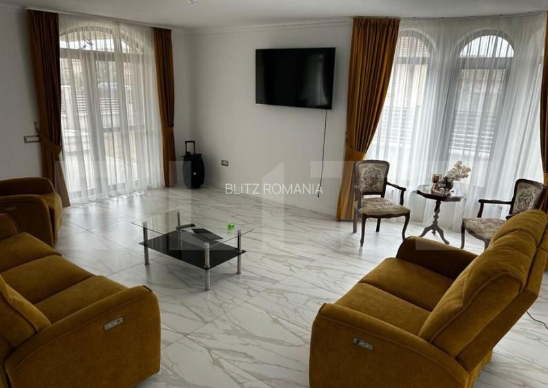 Va propunem spre vanzare casa cu design deosebit construita in anul 2024. Aceasta proprietate este amplasata pe un teren generos de 570 mp si este dispusa pe plan parter si etaj. Casa se vinde finisata si mobilata la interior iar exterior semifinisata. Aceasta dispune de geamuri si usile sunt marca Gealan, usi de interior marca porta doors, incalzirea este realizata in pardoseala la ambele niveluri, pompa de caldura marca Mitsubishi cu dubla utilitate iarna incalzire si vara racire cu termostate, balcoane hidroizolate si imbracate cu gresie si marmura. Constructia casei este din BCA, sistemul de acoperis este Creaton cu garantie 50 ani. Burlanele, doliile si jgheaburile marca Lindab. Izolatie exterioara cu polistiren de 15 cm. Tavanul etajului este podit cu scandura si spuma de 15-20 cm. Suprafata desfasurata este de 346 mp incluzand terasele, balcoanele si scarile de acces. Casa are 143 mp utili la parter plus terasa de 25mp si 146 mp la etaj. Terenul are 575 mp. Parterul este compus dintr-o camera separata (birou), camera tehnica, o baie mare, o sufragerie spatioasa cu acces la o terasa exterioara, o bucatarie cu acces la zona de luat masa si la sufragerie prin usi culisante de sticla securizata, dar si cu acces la o alta terasa exterioara, un mic hol de acces la spatele casei si scarile de acces la etaj. Etajul este compus din 3 dormitoare, unul dintre dormitoare are o baie proprie, doua dresinguri si un balcon mare. Celelalte doua dormitoare cu balcon propriu exterior avand intre ele un hol cu o deschidere interioara de tip balcon. La etaj se mai gaseste inca o baie mare si un dresing. Toate camerele de la etaj au balcon. Scarile de acces la etaj sunt din marmura iar balustradele atat la scari cat si balconul interior sunt confectionate din sticla securizata, la etaj avand un iluminator natural. Tot mobilierul din casa este facut la comanda si de inalta calitate (exclus canapele si paturi). Toata aparatura electrocasnica este de inalta calitate (AEG+Haier+Samsung) cu garantie extinsa. Curtea imprejmuita cu gard din beton si panouri din aluminiu si usa auto automatizata. Curtea are trotuare, spatiul verde cu instalatie de irigare automatizata dar si o casuta spatiu de