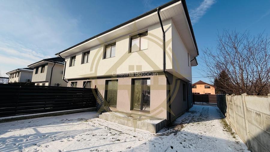 Casa este bine compartimentata, avand un total de 4 camere, din care 3 dormitoare, un living spatios, o bucatarie inchisa, 3 bai, un dressing, o terasa exterioara, o gradina amenajata si 2 locuri de parcare exterioare.