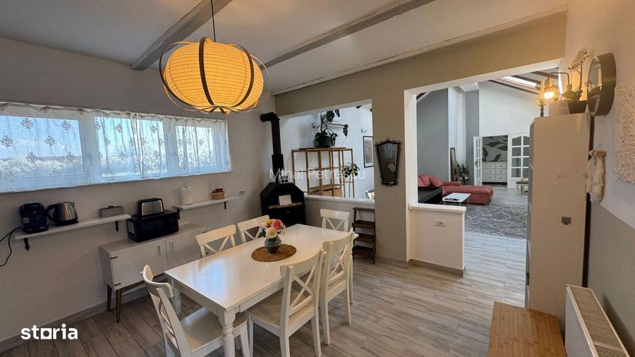 Intr-o zona linistita din Snagov, Aleea Codrii Cosminului 22 aceasta proprietate ofera exact acel echilibru rar intre stil de viata si investitie. Nu vorbim doar despre o casa complet mobilata si utilata modern, ci despre un concept deja validat: locuinta + business de inchiriere pe termen scurt si mediu, activ de peste 2 ani pe Airbnb si Booking, cu randamente reale intre 8% si 12% anual(cu sau fara operator ).Casa impresioneaza din primul moment prin spatiul deschis, tavanele inalte cu grinzi aparente si lumina naturala care inunda livingul. Zona de zi este gandita pentru confort si relaxare, cu bucatarie complet echipata si dining primitor, iar dormitoarele sunt amenajate modern, intr-un stil cald si echilibrat, exact genul de spatiu care atrage si converteste in zona de short-term rental.Simultan containerul amenajat modern impresioneaza si el prin intimitatea, eficienta si functionalitate ce confera spatiul perfect de relaxare pentru toate sezoanele, iar ciubarul folosit fiind atractia principala, iarna cu frig si zapada, sau vara torida pentru a te racori. Tot ciubarul este clar un diferentiator care atrage constant