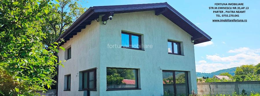 PROPRIETATE IN COM. DUMBRAVA ROSIE VILA S+P+E SI TEREN, LA 10 MIN DE ORAS, 140.000 EURO NEG. Daca va doriti sa scapati de aglomeratia urbana, de grijile si stresul cotidian, FORTUNA IMOBILIARE ofera spre achizitionare aceasta proprietate situata in intravilanul com. Dumbrava Rosie, intr-o zona linistita cu case, verde si aer curat, la 7 km de Mun. Piatra Neamt. Proprietatea este compusa din suprafata de 1.100 mp teren, pe care este edificata o casa cu regim de inaltime S+P+E, cu amprenta la sol de 70 mp, suprafata desfasurata de 210 mp, finalizata in anul 2018. Casa este construita pe fundatii din beton armat, zidarie din BCA, acoperita cu tabla profilata tip Lindab mata. Este prevazuta cu termosistem exterior integral cu polistiren de 10 cm, usi si geamuri din termopan VEKA 3 sticle, cu 7 camere, ce asigura o buna izolatie termica si fonica. Pentru izolatia interioara au fost folosite profile cu vata minerala de 5 cm si rigips verde (pereti si tavane), vata minerala de 10 cm si folie de aluminiu termoreflector cu vapori 15 straturi (acoperis) si vata minerala de 20 cm (tavanul de la etaj). Scara interioara si planseele dintre nivele sunt construite din beton armat. Este compartimentata astfel: Subsol : 3 camere + camera tehnica prevazuta cu boiler electric de 143 l, pentru apa calda. Parter: hol, living, baie, bucatarie. Etaj : 2 dormitoare mari, baie. Proprietatea este prevazuta cu sistem de supraveghere video. Este conectata la reteaua publica de electricitate si de apa, iar gazul metan se afla in fata portii. Are fosa septica betonata de 32 m3 cu decantor. Incalzirea casei se face prin intermediul unor calorifere electrice moderne si performante (provenienta Franta), prevazute cu prize si termostate digitale individuale incorporate, iar intrerupatoarele, prizele si corpurile de iluminat (inclusiv pe fatada exterioara) au aceeasi origine. Casa a fost conceputa pentru alimentare electrica prin intermediul sistemului fotovoltaic. Terenul este plan, imprejmuit cu gard cu porti cu inchidere centralizata. Casa este construita cu suflet, cu materiale de cea mai buna calitate, ca pentru a fi locuita de catre proprietari, acestia punand accent pe durabilitate, estetica si functionalitate. Pret 140.000 euro usor neg. Pentru o prezentare detaliata a acestei oferte, furnizarea unor informatii suplimentare referitoare la situatia juridica / identificarea imobilului si programarea unei vizionari, va invitam la sediul nostru, Fortuna Imobiliare, situat pe str. M. Eminescu, nr. 35, ap. 13, parter, langa fostul Tribunal, tel. contact