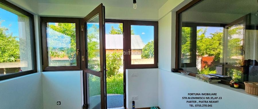 PROPRIETATE IN COM. DUMBRAVA ROSIE VILA S+P+E SI TEREN, LA 10 MIN DE ORAS, 140.000 EURO NEG. Daca va doriti sa scapati de aglomeratia urbana, de grijile si stresul cotidian, FORTUNA IMOBILIARE ofera spre achizitionare aceasta proprietate situata in intravilanul com. Dumbrava Rosie, intr-o zona linistita cu case, verde si aer curat, la 7 km de Mun. Piatra Neamt. Proprietatea este compusa din suprafata de 1.100 mp teren, pe care este edificata o casa cu regim de inaltime S+P+E, cu amprenta la sol de 70 mp, suprafata desfasurata de 210 mp, finalizata in anul 2018. Casa este construita pe fundatii din beton armat, zidarie din BCA, acoperita cu tabla profilata tip Lindab mata. Este prevazuta cu termosistem exterior integral cu polistiren de 10 cm, usi si geamuri din termopan VEKA 3 sticle, cu 7 camere, ce asigura o buna izolatie termica si fonica. Pentru izolatia interioara au fost folosite profile cu vata minerala de 5 cm si rigips verde (pereti si tavane), vata minerala de 10 cm si folie de aluminiu termoreflector cu vapori 15 straturi (acoperis) si vata minerala de 20 cm (tavanul de la etaj). Scara interioara si planseele dintre nivele sunt construite din beton armat. Este compartimentata astfel: Subsol : 3 camere + camera tehnica prevazuta cu boiler electric de 143 l, pentru apa calda. Parter: hol, living, baie, bucatarie. Etaj : 2 dormitoare mari, baie. Proprietatea este prevazuta cu sistem de supraveghere video. Este conectata la reteaua publica de electricitate si de apa, iar gazul metan se afla in fata portii. Are fosa septica betonata de 32 m3 cu decantor. Incalzirea casei se face prin intermediul unor calorifere electrice moderne si performante (provenienta Franta), prevazute cu prize si termostate digitale individuale incorporate, iar intrerupatoarele, prizele si corpurile de iluminat (inclusiv pe fatada exterioara) au aceeasi origine. Casa a fost conceputa pentru alimentare electrica prin intermediul sistemului fotovoltaic. Terenul este plan, imprejmuit cu gard cu porti cu inchidere centralizata. Casa este construita cu suflet, cu materiale de cea mai buna calitate, ca pentru a fi locuita de catre proprietari, acestia punand accent pe durabilitate, estetica si functionalitate. Pret 140.000 euro usor neg. Pentru o prezentare detaliata a acestei oferte, furnizarea unor informatii suplimentare referitoare la situatia juridica / identificarea imobilului si programarea unei vizionari, va invitam la sediul nostru, Fortuna Imobiliare, situat pe str. M. Eminescu, nr. 35, ap. 13, parter, langa fostul Tribunal, tel. contact