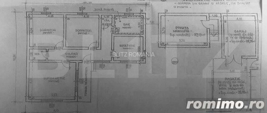 Blitz ofera spre vanzare casa cu 3 camere in zona Dorobantul, construita in anul 1972, cu fundatie de beton, pereti din caramida, planseu din beton, acoperis de tabla. Este amplasata pe un teren cu o suprafata de 510 mp, cu deschidere de 30 ml. Casa dispune de 2 beciuri, 2 garaje, sobe si calorifere, terasa neacoperita, parchet, mozaic in baie si bucatarie, apa, canalizare, gaze, curent electric, centrala termica. Este amplasata intr-o zona linistita, cu drum privat de acces, in apropiere de statii pentru mijloacele de transport in comun, supermarketuri, scoala si gradinita. Cod oferta / ID BLITZ: P14060