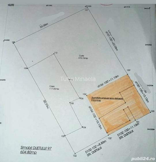 Teren de vanzare Strada Duetului, zona Parcul Bazilescu Se ofera spre vanzare teren situat pe Strada Duetului, intr-o zona lini?tita, aproape de Parcul Bazilescu. Suprafa?a terenului este de 500 mp Pe proprietate exista o casa ?i un garaj in curte, oferind un avantaj important pentru viitorul proprietar (locuire, renovare sau dezvoltare). Separat, se vinde ?i partea marcata cu portocaliu, pe care se afla o casa, aceasta putand fi achizi?ionata individual sau impreuna cu terenul principal. In varianta de achizi?ie integrala, intreaga proprietate insumeaza 600 mp, beneficiind de o deschidere mai generoasa la Strada Duetului(pentru investi?ie sau dezvoltare). Zona beneficiaza de acces rapid catre mijloace de transport, ?coli, magazine ?i alte facilita?i urbane. Pre? teren 500 mp: 600.000 (Detalii privind pre?ul pentru partea portocalie la cerere) Pentru detalii suplimentare nr telefon ID anun? : 1768772984