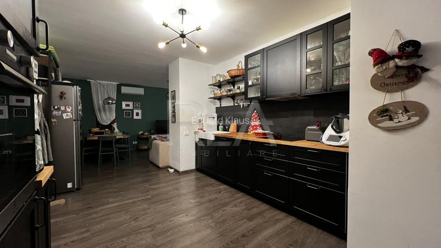 Bucataria este deschisa si bine integrata, cu functionalitate reala prin depozitari eficiente, cu finisaje fluide, o continuitate fireasca a zonei de zi.