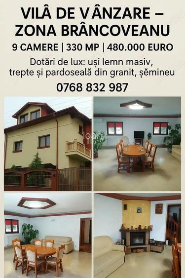 Zona premium Brancoveanu strada lini?tita, ideala pentru familie sau business! Direct proprietar fara comision! Vand vila eleganta ?i spa?ioasa, perfecta pentru locuit sau pentru investi?ie (firma, clinica, gradini?a etc.) Detalii cheie: Construita in 2010 330 mp suprafa?a construita 200 mp teren 9 camere 3 bai 3 locuri de parcare Regim: Subsol + Parter + Etaj + Mansarda Finisaje & Dotari Premium: Pardoseli & trepte din granit ?emineu placat cu granit U?i interioare din lemn masiv Izola?ie exterioara (polistiren) Terasa amenajata + curte Zona foarte lini?tita, ferita de trafic Pre?: 480.000 Negociabil ne putem in?elege la fa?a locului! Contact direct proprietar: Disponibil ?i pe WhatsApp! ID anun? : 1665159788