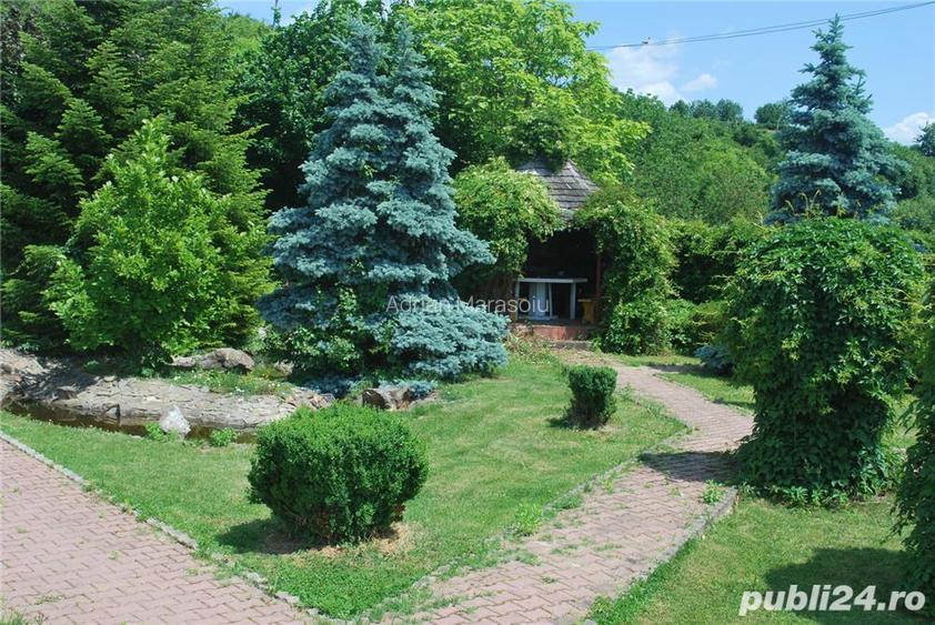 Vila de exceptie, in duplex, este amplasata la ca. 100m de DN 7, intr-o zona linistita si inconjurata de verdeata, cu gradina terasata de 3700mp, piscina, acces la teren de tenis. Intrarea catre vila trece prin 1000mp de padure proprie mixta (castani, plopi, stejari, brazi) plantati de 20 de ani. Peisaj unic. Arhitectura deosebita si functionala (proiect german), an de constructie 1998. Parter 160mp, Etaj 90mp Demisol 100mp. Vila este compusa din: Sufragerie de 70mp (cu semineu), 4 Dormitoare, 3 Bai (cate una la fiecare etaj), WC de serviciu, Birou, Biblioteca, Bucatarie, Spalatorie, Balcoane, Terasa si Dependinte. 2 Garaje. Piscina cu dimensiunea de 8x16m, terase, loc de gratar si foisor (filigorie). Ferestre termopan cu jaluzele integrate. Constructie solida cu ziduri exterioare de 50cm si izolatie termica la tavane asigura o atmosfera comfortabila atat vara cat si iarna. Suprafata locuibila de 350mp este judicios impartita. Cu mici modificari, poate fi folosita si de 2 familii, demisolul avand intrare separata. Sursa proprie de apa (foraj la 95m adancime) asigura cheltuieli de intretinere reduse. Incalzire termica pe gaz. Aleile si curtea sunt pavate cu dale din beton, aleea de intrare in curte este asfaltata. Pret negociabil 385.000,00 ID anun? : 1559373917