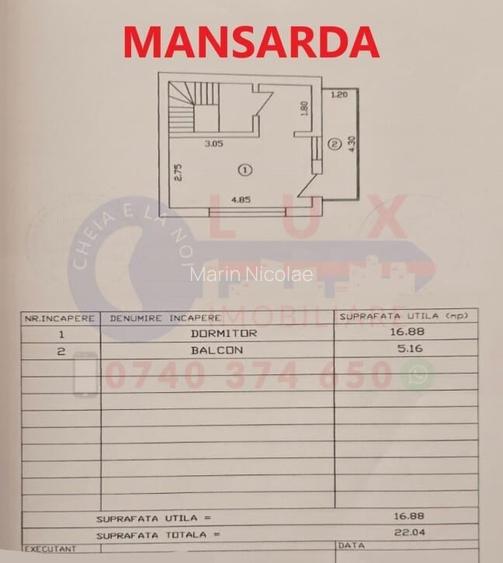 AGENTIA LUX IMOBILIARE va propune spre vanzare vila de tip P+M, amplasata central, intr-o zona linistita. Suprafata terenului este de 174 mp din care suprafata construita este de 106 mp si dispune de 2 fronturi stradale de 21,53 ml, respectiv de 8,36 ml. Casa (constructie BCA 2016) are suprafata desfasurata de 137 mp si este compartimentata astfel: - PARTERUL este compus din: hol, living, doua dormitoare, dressing, bucatarie si doua grupuri sanitare. Locuinta dispune de 2 intrari. - MANSARDA dispune de un dormitor, balcon si spatiu de depozitare Utilitati: apa curenta, energie electrica, canalizare si gaze. Casa este dotata cu centrala termica pe gaz pentru a asigura confortul termic in perioada rece si centrala electrica pentru incalzirea apei. + Termoizolatie exterioara + Alarma + Supraveghere video + Curte pavata +++ ANEXA cu 2 nivele: GARAJ cu acces stradal pe primul nivel si 2 camere pe cel de-al doilea nivel Datorita amplasarii si compartimetarii, vila poate fi usor transformata in sediu de firma, spatiu birouri, etc PRET 155.000 EURO Contact:
