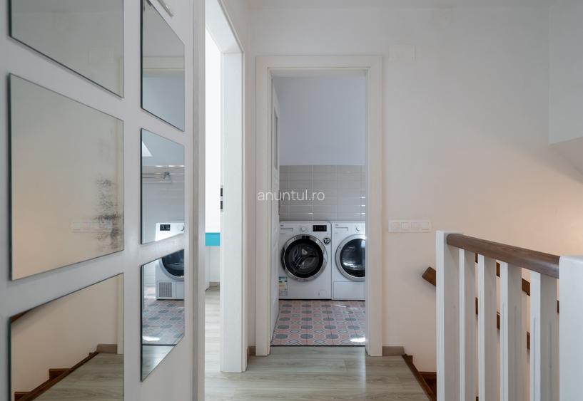 Bine ai venit in Casa 1, cea de langa locul de joaca, parte din minunata comunitate EcoVillas sector 5, formata din 32 de locuinte. Aici te asteapta un nou stil de viata sustenabil, bazat 100% pe energia verde a pamantului. Fiecare casa este dotata cu o pompa de caldura geotermica, CTC, si izolatia acestor case este la standardul de ''Casa Pasiva''. Aceasta casa are inclus si un sistem de racire(passive cooling) cu ventiloconvector Sabiana, conectat la sonda geotermica. Costurile de incalzire si racire sunt minime. Este complet mobilata, dotata cu electrocasnice de calitate, a fost proaspat renovata pentru a fi predata corespunzator. Cu o suprafata utila de 112 mp, gradina proprie, loc de parcare si peste 1.000 mp de spatii comune, locuinta are o functionalitate foarte buna a spatiului. Totul este functional, baia de parter este dotata cu cabina de dus, cea de la etaj are masina de spalat, uscator si cada cu hidromasaj, iar pentru cine doreste se poate monta bideu atat in interior sunt spatii de spatii de depozitare, dresing in fiecare dormitor, camera tehnica, cat si in gradina este amenajat un spatiu de depozitare pentru biciclete, masina de tuns iarba. Casa a fost insufletita de o familie cu doi copii care au crescut liberi, jucandu-se in curte si in locul de joaca alaturi de ceilalti mici locatari ai cartierului. Mobilierul este realizat cu bun gust, atentie si materiale de calitate, iar starea in care se afla, chiar si dupa ani de utilizare, spune multe despre modul in care casa a fost ingrijita. Din punct de vedere tehnic, proprietatea respecta toate principiile unei Case Pasive, cel mai inalt standard de eficienta energetica din lume: -Pompa de caldura geotermala sol-apa, importata din Suedia, cu foraj la 130 metri adancime;CTC Heatpumps(parte din grupul Nibe) -0% emisii de carbon si reducere de pana la 90% a costurilor de incalzire si racire, coeficientul energetic al pompei CTC 406 fiind de 1=5 (COP); -Geamuri Rehau Geneo, create special pentru casele pasive, cu sistem de ventilare; Usa de la terasa este glisanta; -Incalzire in pardoseala; -Izolatie la standardul unei case pasive, cu: -25 cm polistiren la exterior (EPS 150); -30 cm vata minerala la tavan; -15 cm polistiren sub placa parterului (EPS 150); -Sistem de ventilare PAX (Suedia); -Usa de intrare importata din Suedia, marca Snickarper, special conceputa pentru casele pasive. Construit acum 10 ani, ansamblul Ecovillas din sectorul 5 (32 de case pasive) si-a pastrat notorietatea in materie de inginerie si calitate premium. Foarte rar apare oportunitatea ca o astfel de locuinta sa fie disponibila spre vanzare iar aceasta este o proprietate cu totul speciala: o casa de margine, situata langa locul de joaca, cu numeroase extraoptiuni, printre care sistemul de racire pasiva, complet mobilata si utilata modern.