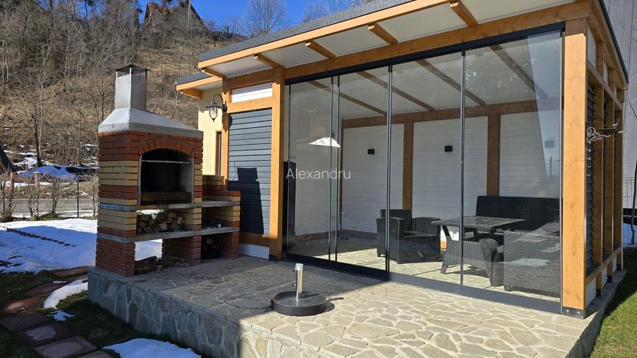 De vanzare casa tip A in complex de 10 case, suprafata utila 100 mp si un teren cu o suprafata de 465 mp. Casa poate fi casa de vacanta dar si investitie in domeniul turismului. Compartimentata astfel: Parter: living, bucatarie deschisa , dormitor , baie Etaj: dormitor , baie ATENTIE casa este facuta ca pentru mine eu fiind constructorul acestui complex si proprietar a doua case in complex. Casa este facuta foarte bine structura lemn stratificat, izolatie cu vata 200 mm. Pompa de caldura si incalzire in pardoseala in toata casa si ventiloconvector pentru racire (daca este cazul) Sistem smart home pentru controlul de la distanta al luminilor, incalzirii, termostat, (pe fiecare zona), camere supraveghere etc... In living la parter gasim si un semineu cu lemne care are rol decorativ dar si de incalzire. Curtea amenajata cu gazon si plante decorative. Tot in curte gasim foisor + grup sanitar + gratar + gazebo cu loc pentru foc + loc parcare auto + magazie. Casa se vinde mobilata si utilata. Pentru informatii suplimentare va rog sa ma contactati.