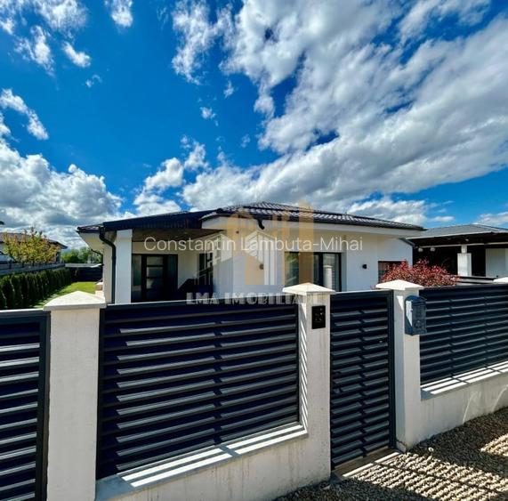 Odata ce am intrat in curtea proprietatii regasim tot spatiul amenajat cu gazon, alee (pavata cu travertin de exterior),zone de arbusti decorate cu piatra de rau si un loc de parcare,al doilea loc de parcare se poate amenaja in partea stanga a proprietatii in functie de necesitate.