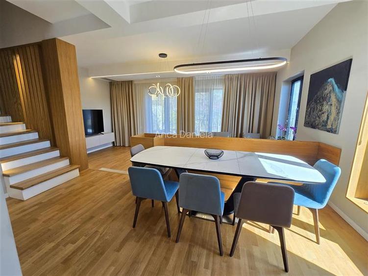 Vila moderna este ideala pentru o familie sau expati care lucreaza in zona de nord a Bucurestiului. Casa este dispusa pe Parter + Etaj + Mansarda si ofera o compartimentare inteligenta si spatii generoase gandite pentru confortul vietii de zi cu zi. Amenajarea interioara a fost realizata in colaborare cu MiSo Architects, studio romanesc recunoscut pentru proiecte rezidentiale contemporane, iar rezultatul este un interior elegant, echilibrat si functional, definit de materiale premium, mobilier modern Rovere si BoConcept si iluminat arhitectural atent integrat. La parter se afla zona de zi, conceputa ca un spatiu deschis si luminos. Livingul de peste 23 mp se continua natural cu zona de dining si bucataria complet utilata, creand un ambient ideal pentru relaxare si socializare. Din aceasta zona se face accesul catre terasa si catre gradina din jurul casei, extinzand spatiul de locuit catre exterior. Etajul este dedicat zonei de noapte si include trei dormitoare confortabile, doua bai moderne si un dressing generos. Compartimentarea este practica si bine echilibrata, oferind intimitate fiecarui membru al familiei. Mansarda completeaza perfect locuinta printr-un open space amplu de aproximativ 43 mp, care poate fi folosit ca birou, camera de relaxare, biblioteca sau spatiu pentru oaspeti. Aceasta flexibilitate transforma locuinta intr-un spatiu adaptabil diferitelor stiluri de viata. Casa beneficiaza de multiple dotari moderne menite sa asigure eficienta energetica si confort ridicat: panouri fotovoltaice, centrala termica proprie, incalzire in pardoseala, boiler, aer conditionat, precum si doua locuri de parcare. Terasele si balconul adauga spatii suplimentare de relaxare, iar curtea verde completeaza atmosfera placuta si aerisita a proprietatii. Prin pozitie, suprafata generoasa si designul contemporan, aceasta vila reprezinta o alegere excelenta pentru familii sau profesionisti care isi doresc o locuinta moderna, bine conectata la oras, dar situata intr-un cadru rezidential calm si bine organizat. Cartierul este format din 4 duplexuri cu iesire in doua strazi: Munteniei si Campului. De altfel, in cadrul complexuluiexista si un loc de parcare destinat vizitatorilor, oferind cofort suplimentar pentru oaspeti.