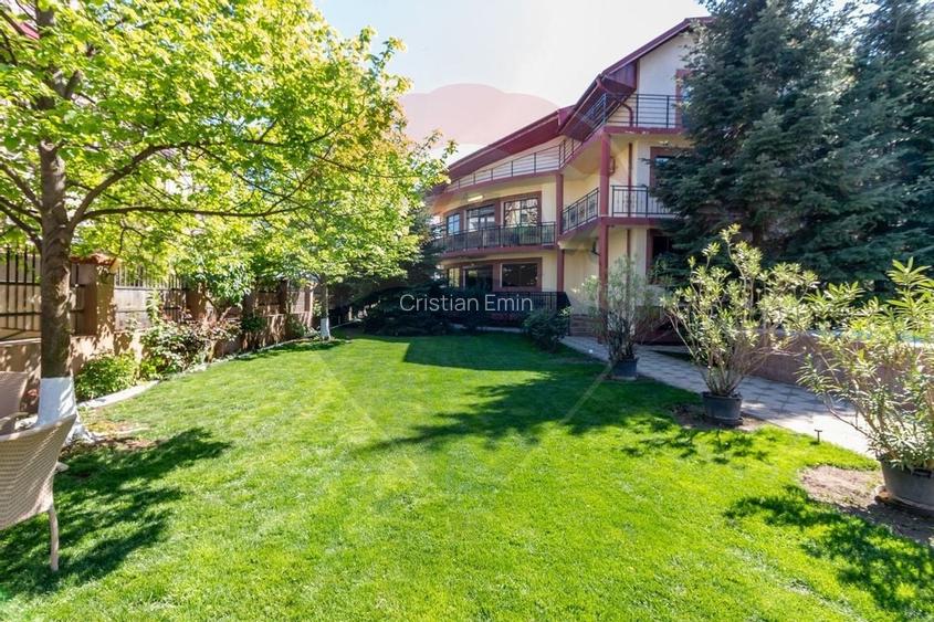 Exteriorul este completat de o curte amenajată, foișor cu grătar, spațiu tehnic și o piscină exterioară cu dimensiuni generoase (19,7 m x 7,5 m), ideală pentru relaxare sau evenimente private.